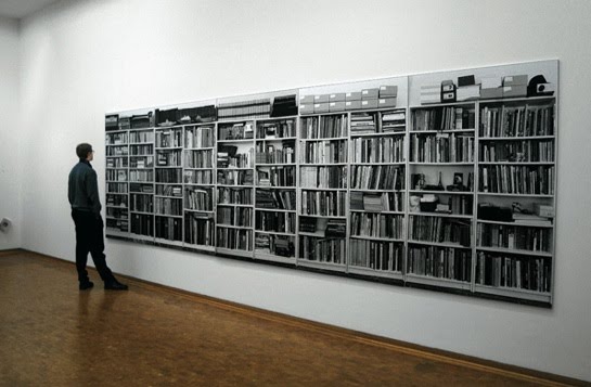 Among the works by Hans-Peter Feldman currently on display at the 303 Gallery in New York City is this one, entitled “Bookshelves.” The gallery’s website says it is “a 5-panel, life-size photograph of Feldmann’s own bookshelves at his home in Düsseldorf. As an artist renowned for using found and discarded objects of others, ‘Bookshelves’ is a rare look at the personal world of a voyeur through the looking glass.”