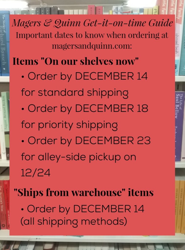 Please note that these deadlines are our best estimate and are subject to available stock levels, mail service operations, and any other supply chain interruptions that may arise. Thank you for your support of independent bookstores!