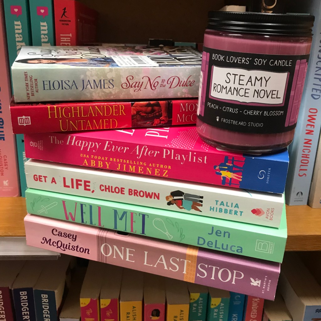 We love our romance section, but romance is a genre that often has multiple books in a series, with multiple series by each author – so it’s impossible to carry everything! Remember: you can always ask a bookseller for comparable recommendations if we’re out of what you’re looking for, plus we can special order just about any book as long as it’s currently in print!